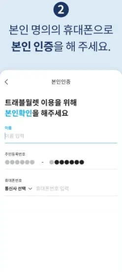 1. 트래블월렛 앱 가입을 위한 약관동의, 본인인증, 사용할 계좌를 입력합니다.