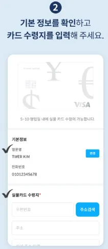 5. 배송지명 및 영문명을 다시 한번 확인 후 아래 신청완료를 클릭하면 카드 발급절차과 완료됩니다.