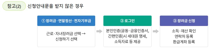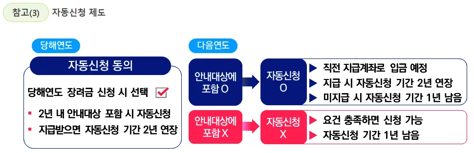 60세 이상 고령자 및 중증장애인이 장려금 신청기간에 동의하면, 향후 2년 내 신청안내 대상 포함 시 자동으로 신청가능합니다.