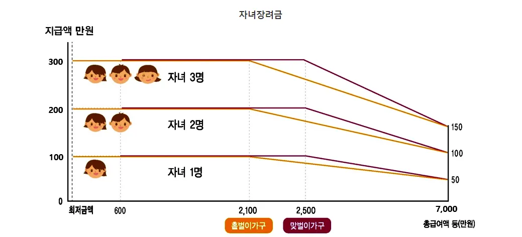 자녀장려금은 신청자녀의 나이가 18세 미만으로 소득기준이 부부합산 4000만 원 미만에서 7000만 원 미만으로 상향되고, 최대지급액도 자녀 1명당 80만 원에서 100만 원으로 인상됐습니다.